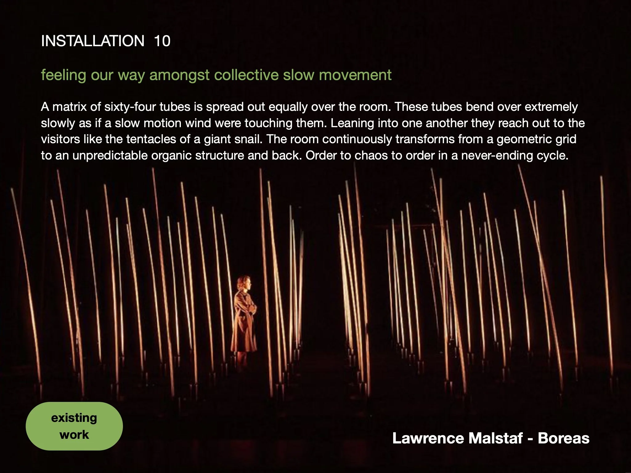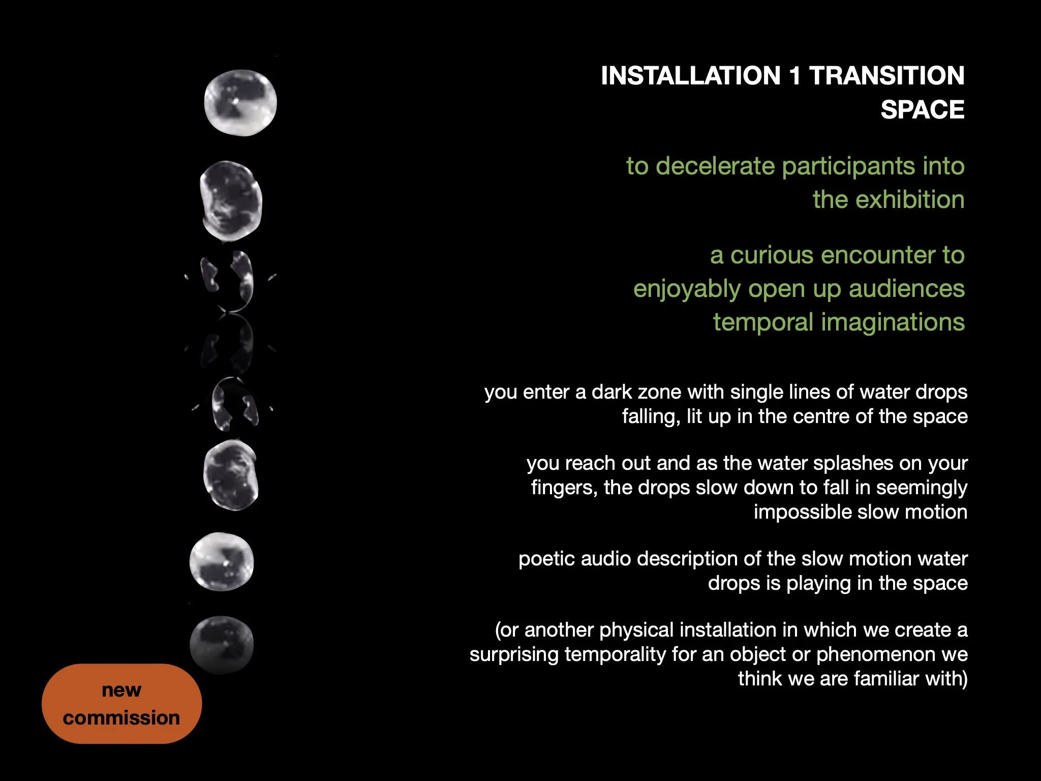 I will develop the curatorial concept further after inviting audience input in the R&D stage and learning from testing with a prototype installation exploring slowness.