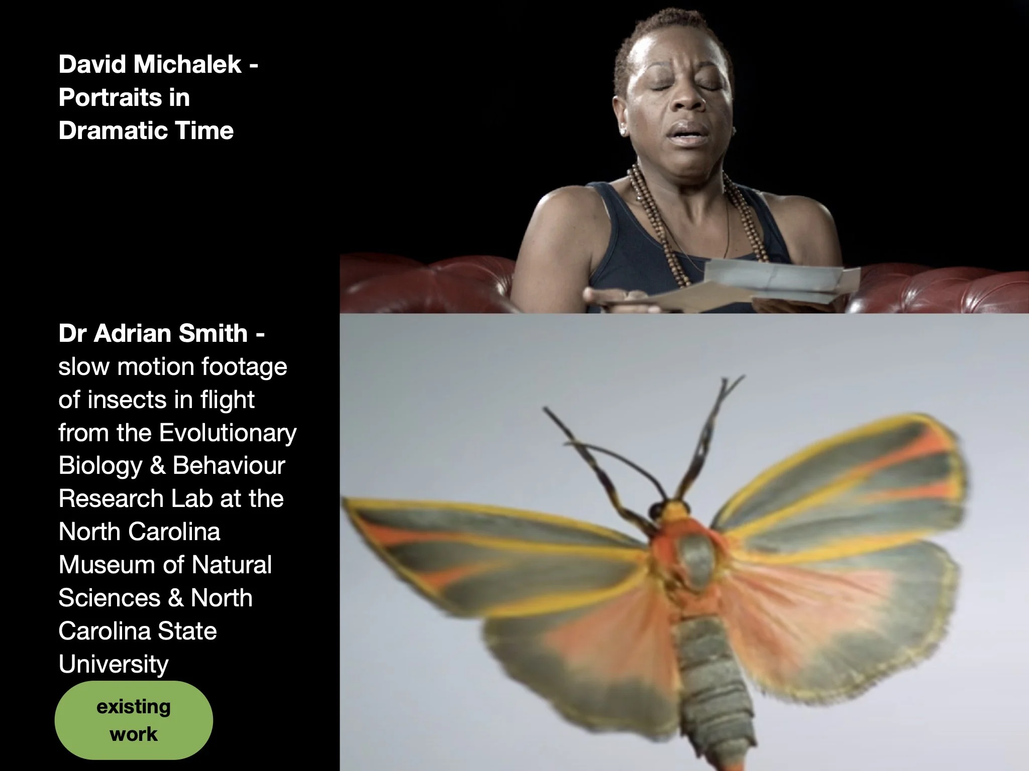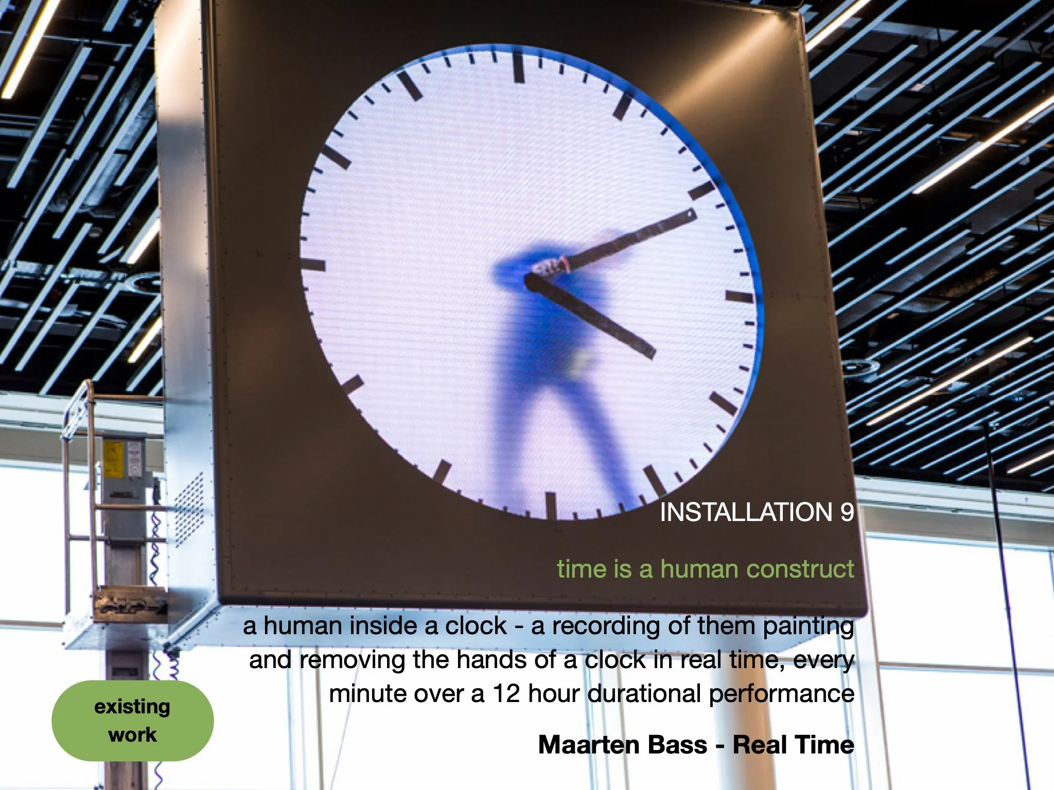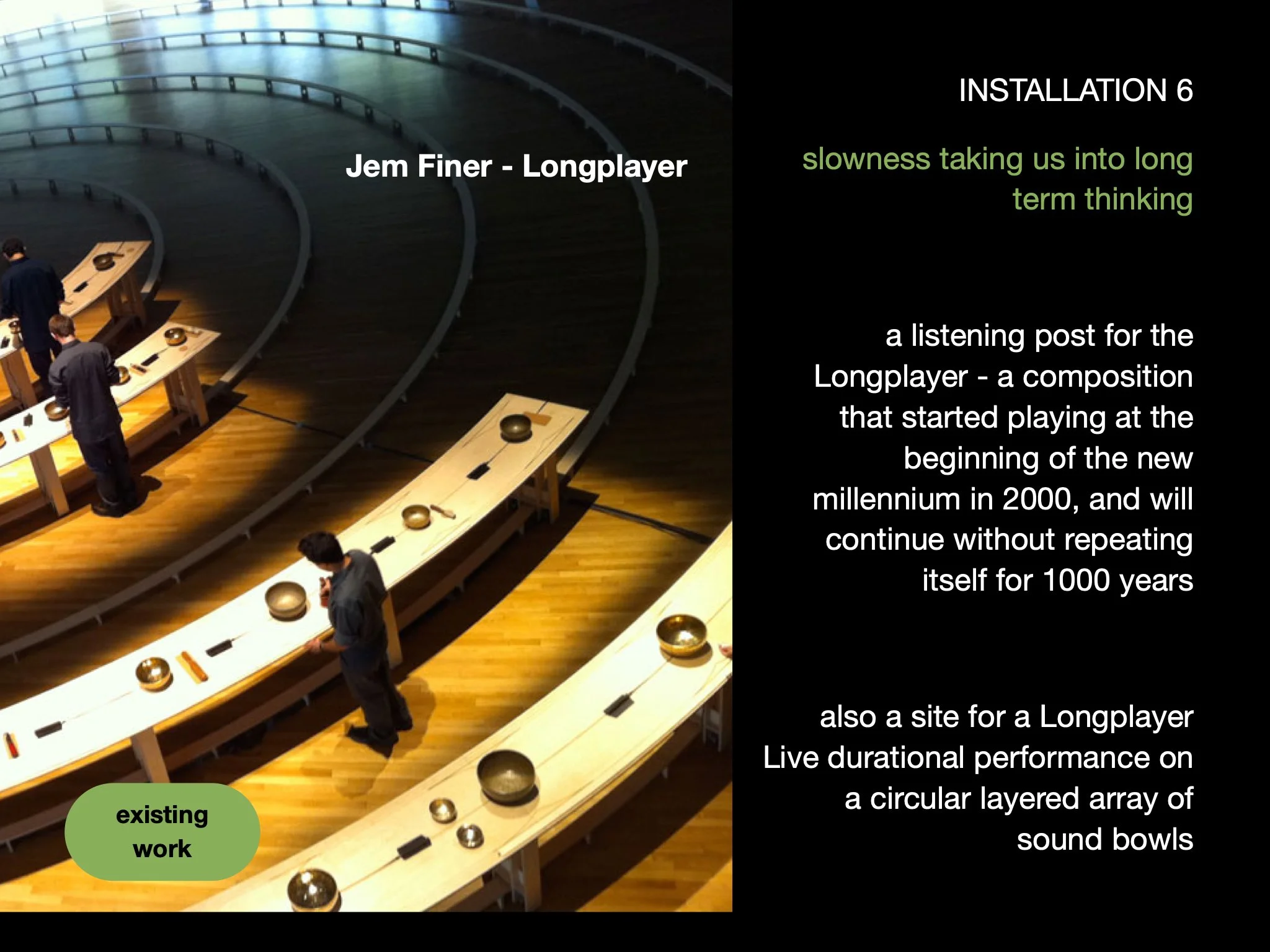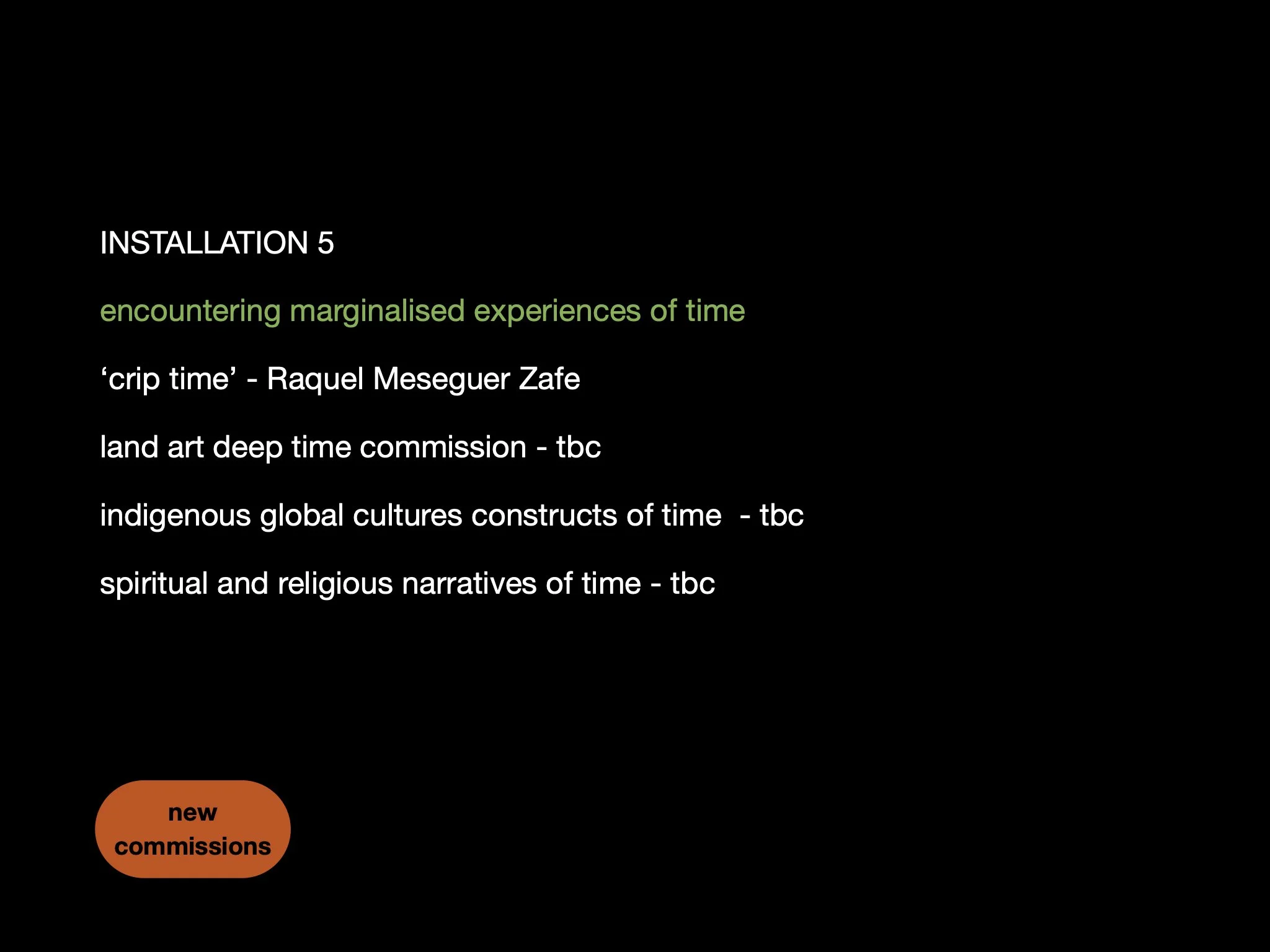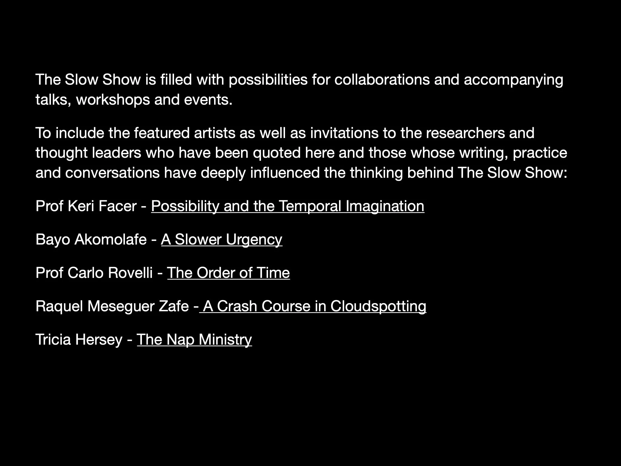 This page shows how I am thinking about The Slow Show as artist curator. It includes curated existing works and new commissions - this page is an outline of the artists and ideas I am initially thinking about. I have not yet contacted any of these artists whose existing work I am interested in including, nor approached anyone for new commissions - this is purely to demonstrate the potential scope and intention.